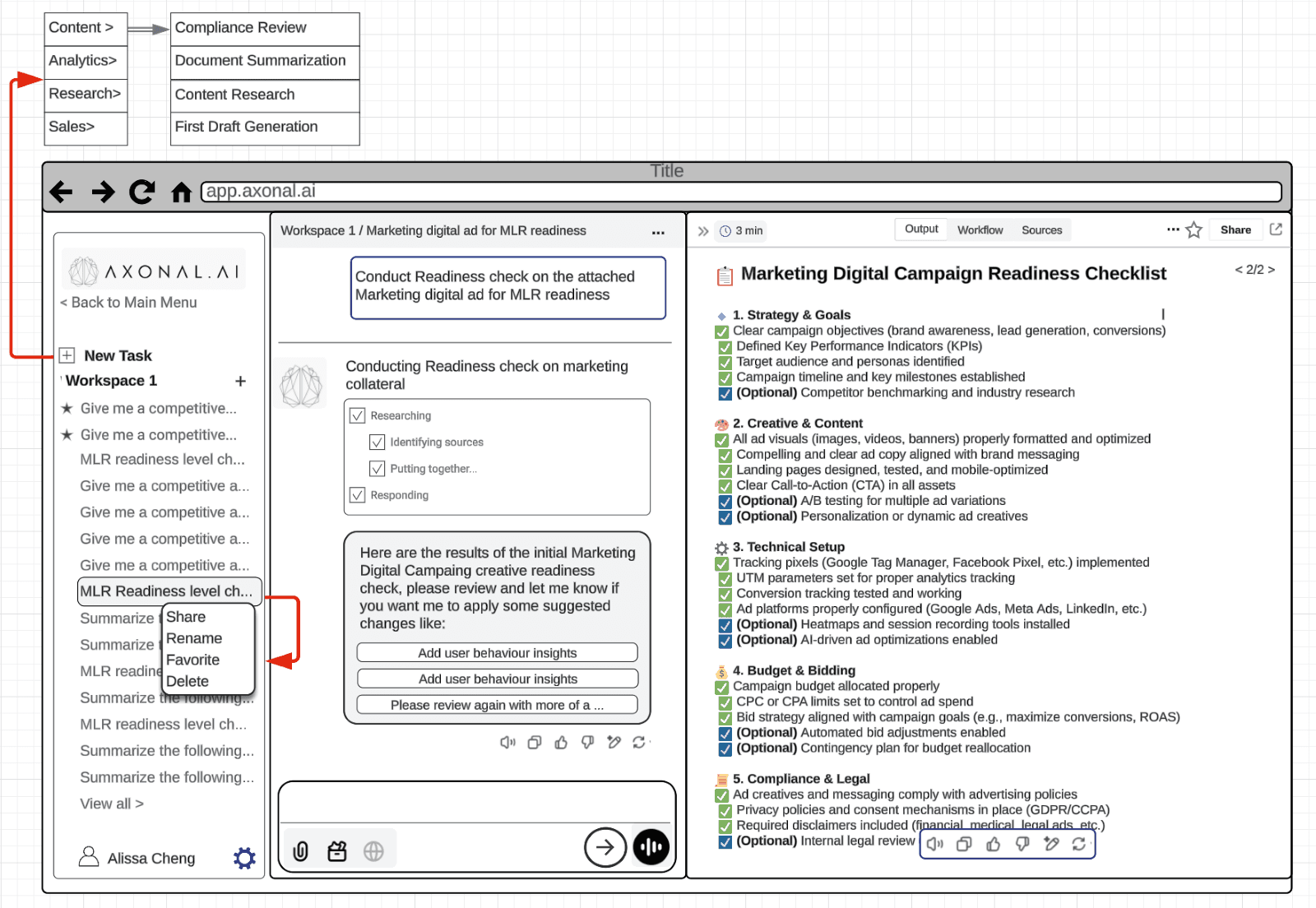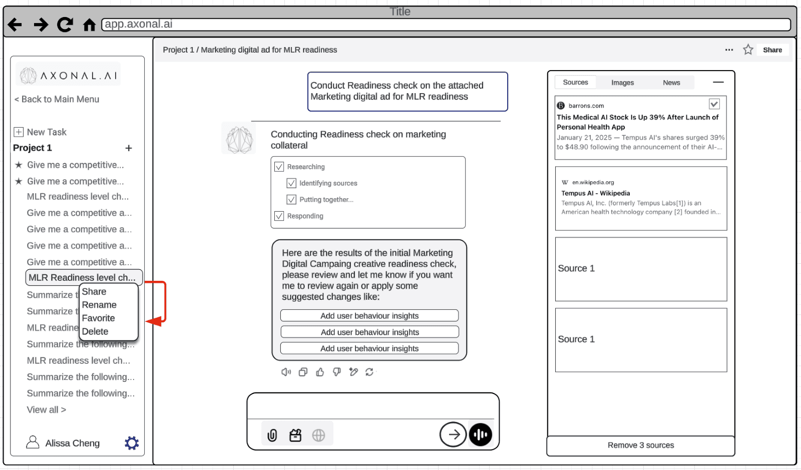 Axonal workspaces allow multiple team members to collaborate with LLM assistance the moment a workspace such as a New Product Launch is created. All outputs stay organized within shared context, edits remain traceable, sources stay linked, and teams can refine work together. The artifact whether a report, content draft, or summary updates live when a user requests changes, such as: “Add a competitive analysis chart at the end.”